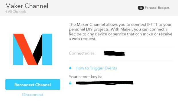 * (Nota: tras hacer el canal fabricante tienes que copiar la clave secreta de IFTTT.)
