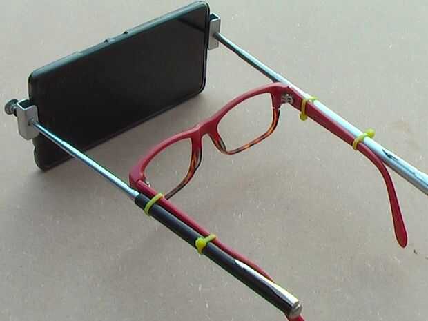 Este smartphone 10 dólares telescopio headmount está conectado con gafas de lectura. Movimientos de la cabeza resultan en grabaciones de vídeo estables y suave. Las manos son libres de utilizar el menú en la pantalla o mostrar algo delante de la cámara.