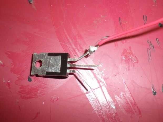 Luego soldar el cable positivo a la patilla exterior restante (el diente de "out").