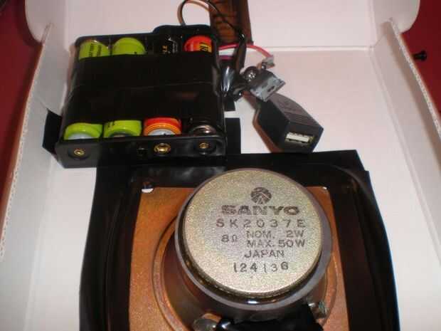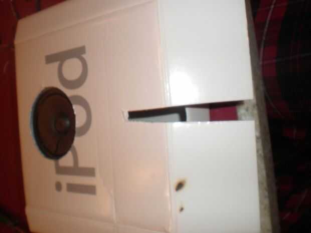 Cortar el agujero. Hacer un anillo alrededor de la bocina con cola loca y pegarlo más centrado posible en el agujero. Aplique presión durante unos 30 segundos y luego la parte exterior del altavoz a la caja para un apoyo extra de la cinta.