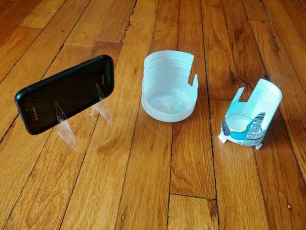 Este es un proyecto rápido para crear un soporte de smartphone simple, una sola pieza. Utilice un trípode para autorretratos o timelapse vídeos, una base para el uso en una mesita de noche, o como un soporte para sostener el teléfono mientras ven vídeos. Estos ejemplos fueron hechos utilizando recipientes encontrados alrededor de mi casa. Las únicas herramientas necesitadas son un par de tijeras y tal vez un marcador.