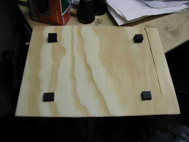 a continuación, he hojeado por encima el portátil para encontrar buenos lugares para las patas de goma de la tierra. Decidí que descansan junto a los pies de la computadora. He marcado los puntos de la pieza de madera contrachapada. Usé pegamento E6000. Es un pegamento "artesanales", pero pegue nada. Pegué las dos pilas de goma primero y luego pegué los cuatro hasta la madera. Dentro de 24 horas estaba seca y eran sólidas como una roca.