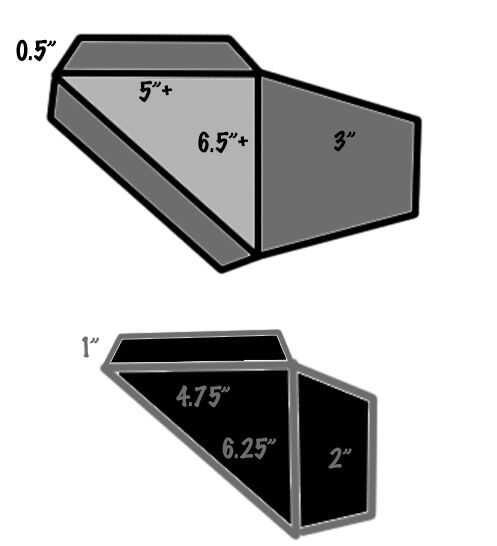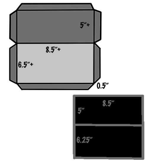 Ver las imágenes por encima de las dimensiones para mis piezas de papel (y a continuación para un Adobe Photoshop archivos con capas para las diferentes piezas). El diseño básico es como una caja de zapatos, unido a la pared por la parte inferior de la caja (la tapa no utilizada), con un lado rectangular corte y dos lados adyacentes se convirtieron en triángulos no rectángulos.