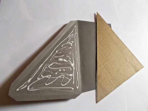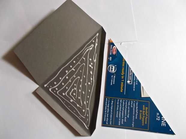 Aplicar el pegamento en el interior de las piezas grises y colocar las piezas correspondientes de cartón en el área de aplicación de pegamento. No plegar y pegar las aletas todavía. El cartón (al menos para mí) es lo suficientemente gruesa que las aletas no doblar la cartulina con adhesivo muy bien así y que sea seguro antes de doblar las aletas hacia abajo y pegado.