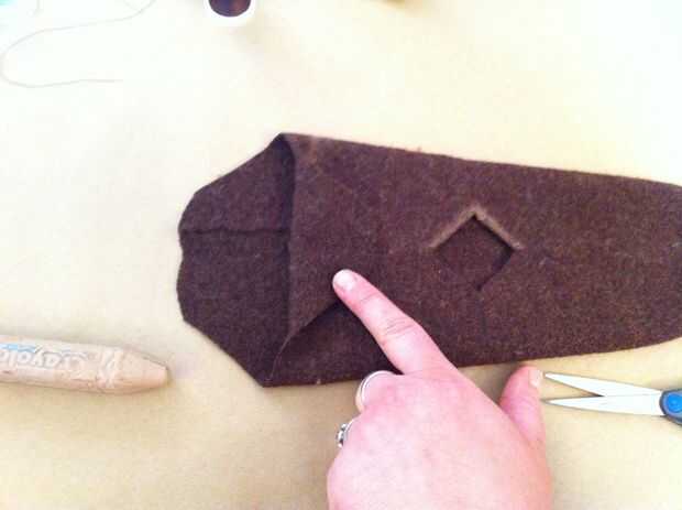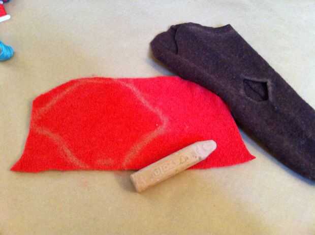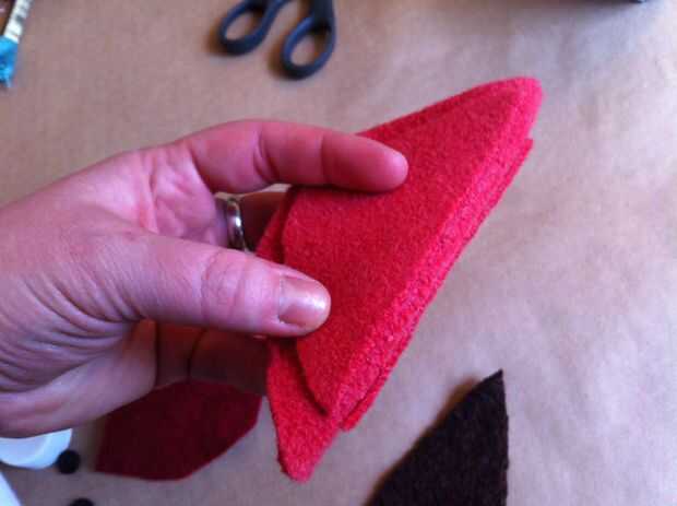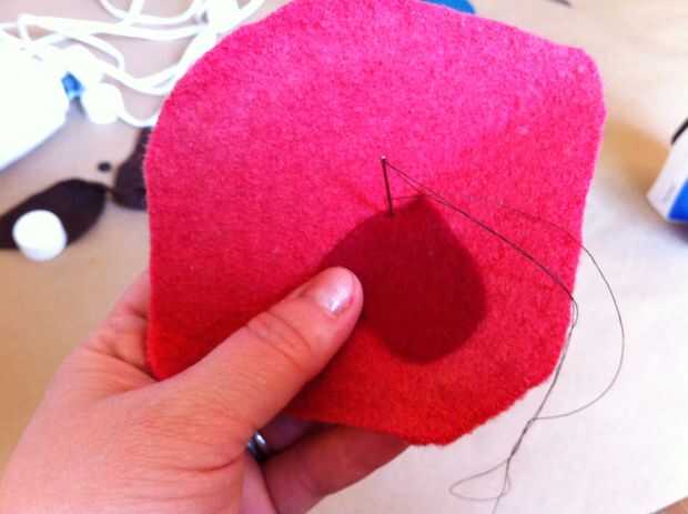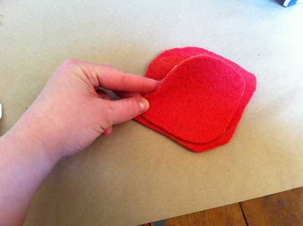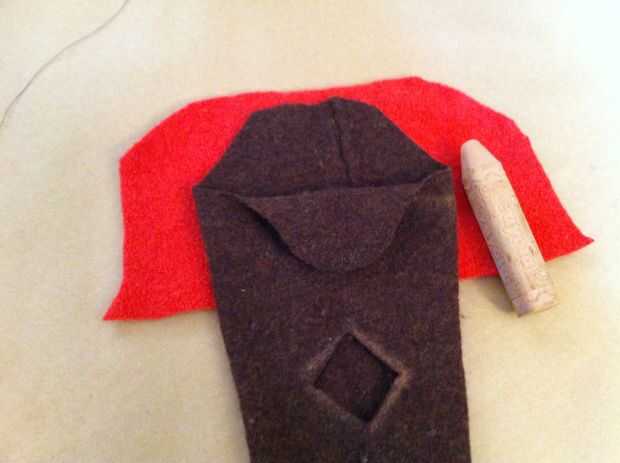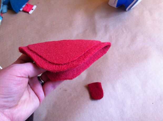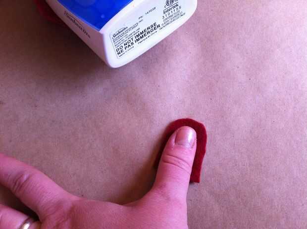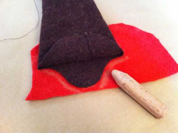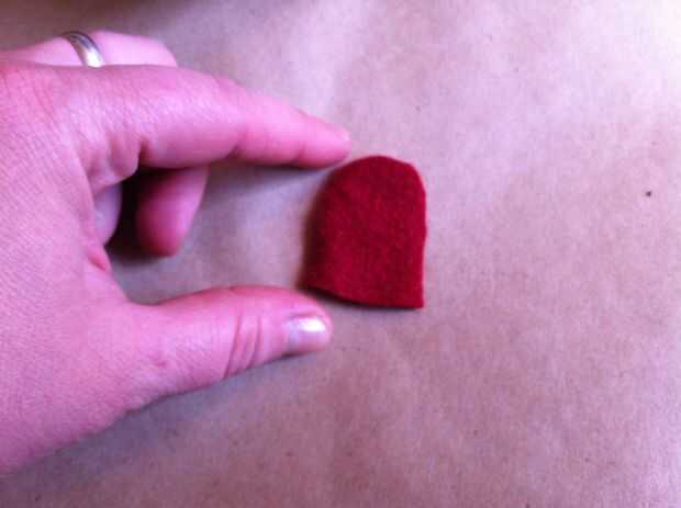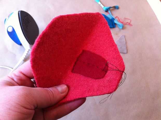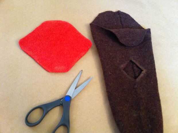 Para hacer la lengua, trace el pulgar (de la articulación del pulgar a la punta) sobre la lana rojo más oscuro. Usted puede hacer más ancho o más estrecho si lo desea, dependiendo de cómo desea que su marioneta para ver. Añadir un poco de hierro en adhesivo en la parte posterior de la lengua, retire el soporte de papel, luego la lengua en la parte delantera de la boca de la marioneta del hierro.