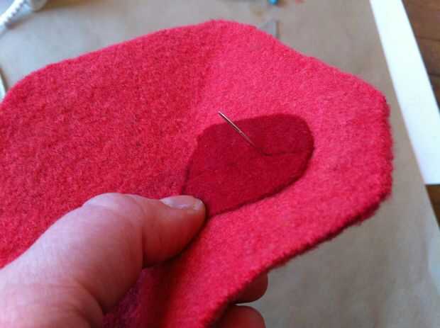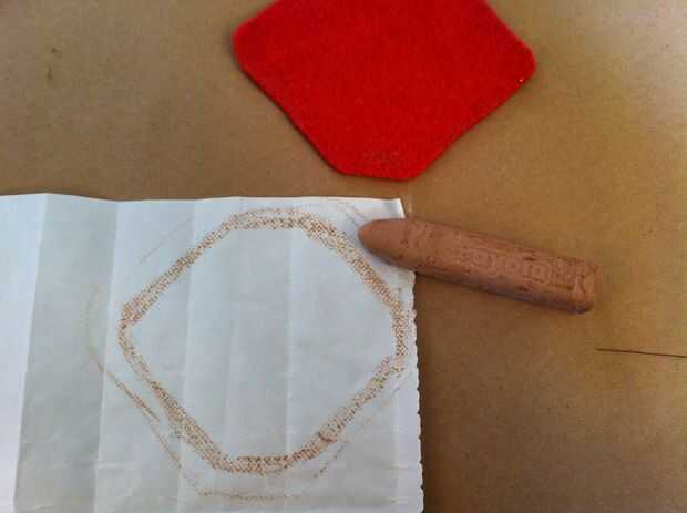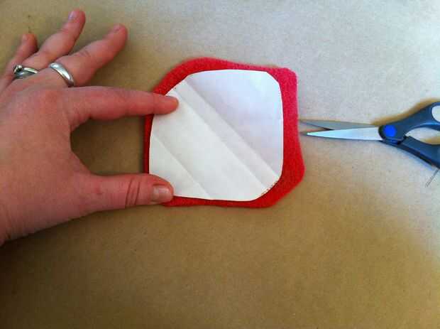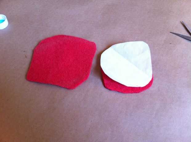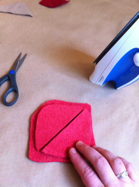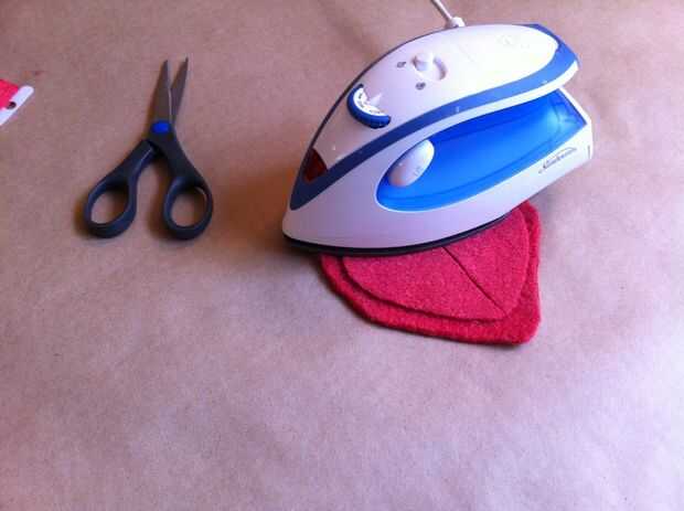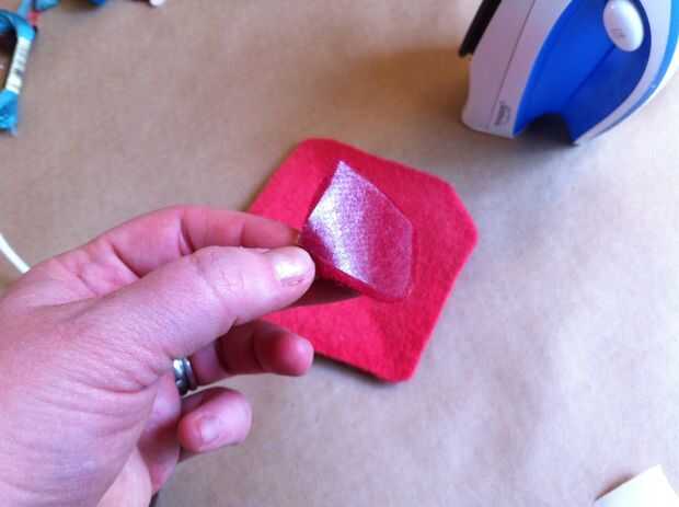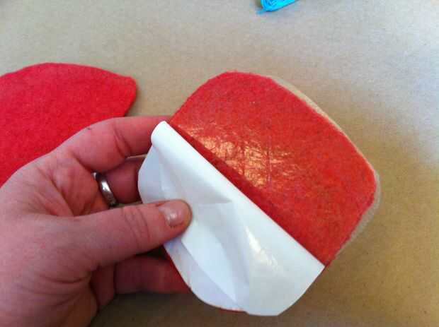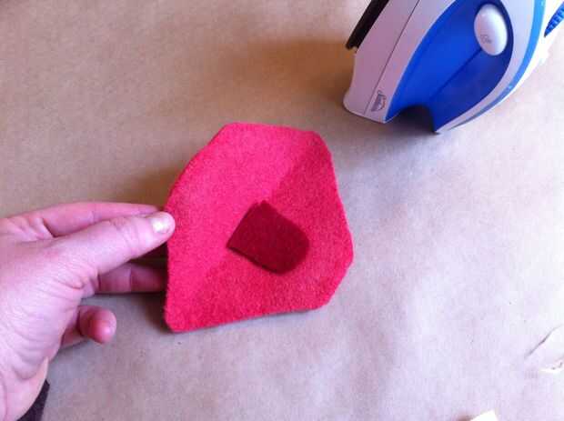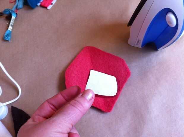 Ahora traza la forma sobre el lado del papel del hierro en adhesivo. Recortar el adhesivo de hierro-en aproximadamente 1/2" dentro de la frontera que apenas trazado, para que el adhesivo es más pequeño que la boca. Seguimiento de este adhesivo en otro pedazo de lana afieltrada. Corte el pedazo más pequeño en forma de boca de la lana y el adhesivo sobre la lana de hierro. Despegue el papel del forro del adhesivo, luego corte el pedazo más pequeño en forma de boca por la mitad horizontalmente (desde una esquina de la boca al otro, no de labio superior labio inferior).