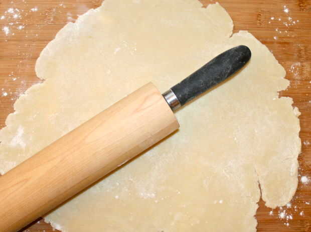 Espolvorear una tabla para cortar o tu contador con harina y usando un rodillo, aplanar una de las más pequeñas bolas de masa hasta que esté lo suficientemente grande como para cubrir la tartera.
