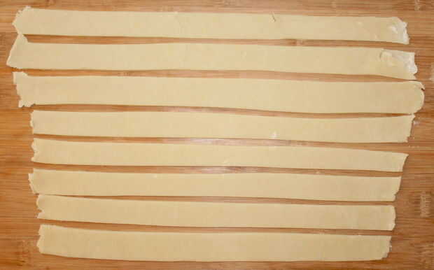 Estirar la segunda bola de masa y reservar para cubrir tu pastel relleno (manzana o durazno), cortar en tiras de un pie de tapa de enrejado (cerezas o arándanos) o cubrir una tartera de segunda para hacer dos tartas al descubierto (calabaza o limón).