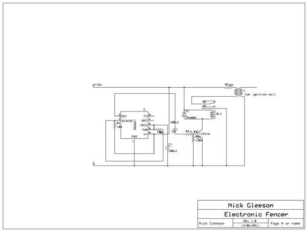 Entonces tuve que limitar la corriente que pasa a través de la bobina de encendido, así que usé una resistencia de potencia de 82 ohms para permitir aprox 1amp pasar a través de la bobina primaria, esto limita la potencia de la salida a un save nivel que no hace daño a mis perros. He probado esto en mi auto, al principio no funcionó muy bien hasta que martilló una tubería de cobre de 2 pies en la tierra y este había conectado al negativo de mi circuito, ahora me metía un choque desagradable, pero inofensivo de la unidad aproximadamente una vez cada 2 segundos. Funciona muy bien, utilicé alambre tirador agrícola con aislantes alrededor de los lechos de flores y después de un par de golpes los perros están encantados de dejar bien las flores.