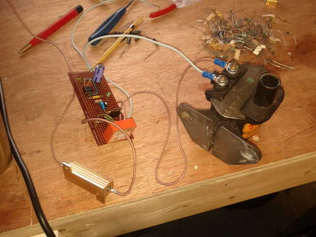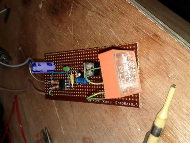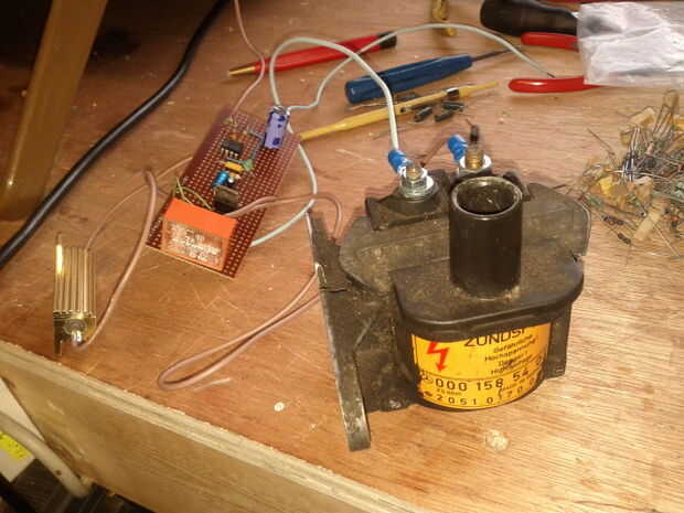Ahora necesitaba diseñar y construir un circuito que le pulso un relé para feeb energía a la bobina de diésel puestos. Uso de mi pan configurar un simple NE555 con un par de resistencias y un condensador para darme 50% ciclo de trabajo. Entonces alimenta la salida en una simple red RC que se alimenta de un transistor de potencia. Porque la bobina diésel puestos consume mucha corriente que necesitaba para el relé para que el transistor es solamente cuando la RC es la carga, he seleccionado los valores que me dan sobre.25 de un segundo a tiempo para el transistor, esto es suficiente para el relais del pulso y hacer que la bobina de una descarga de alto voltaje de gran alcance.