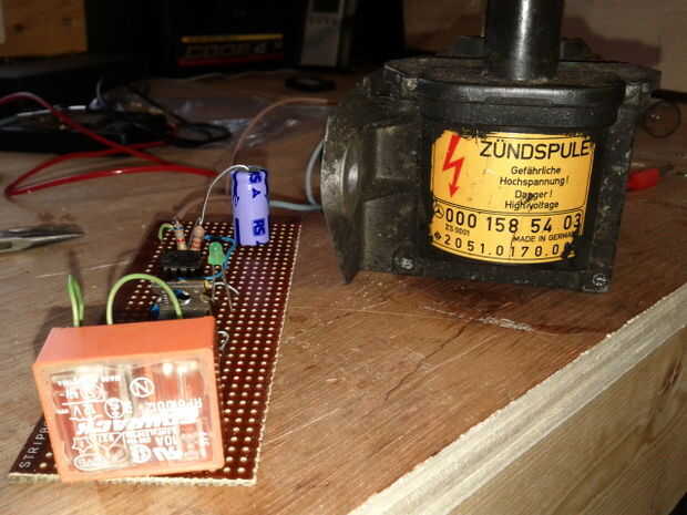 Tengo dos gato russle perros aman a flores, a mi molestia de socios, así que desidir tienen una raíz alrededor en mi caja de partes del proyecto y ver lo que pude llegar a. Low behold me encontré con que tenía una antigua bobina de encendido de un coche de Mercedes jubilado viejo mío, todo lo que necesitaba hacer era a pulso su bobina primaria con 12 voltios para producir un voltaje muy alto en el secundario.