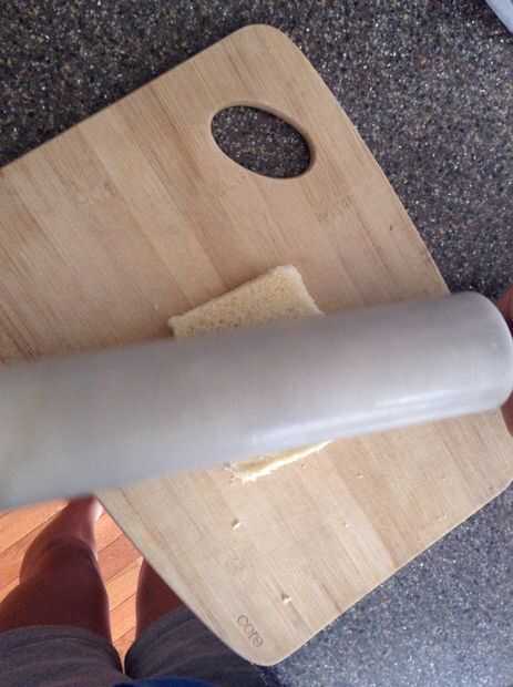 3. Utilice un rodillo para aplanar cada trozo de pan para que sean lo más delgadas posible.