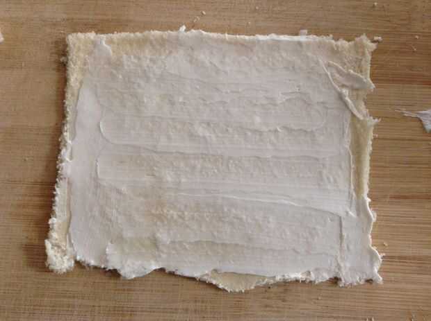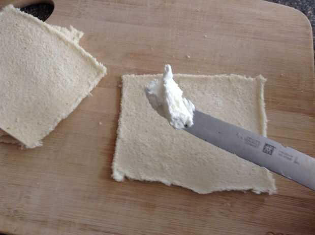 1. tomar una cantidad muy pequeña de queso crema en su cuchillo y untar en el pan en una capa muy delgada.
