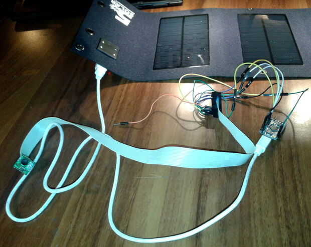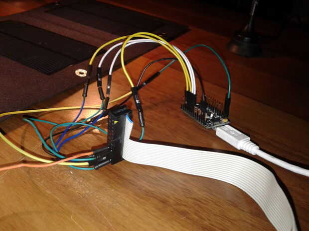 Conectar todos los dispositivos es bastante fácil, el panel solar es simplemente conectado al puerto USB de la base de la chispa, y reemplazamos el sol con dos lámparas de escritorio. El RFM12b y el núcleo de la chispa comunican a través de SPI tradicional, por lo que necesitamos conectar 6 cables: