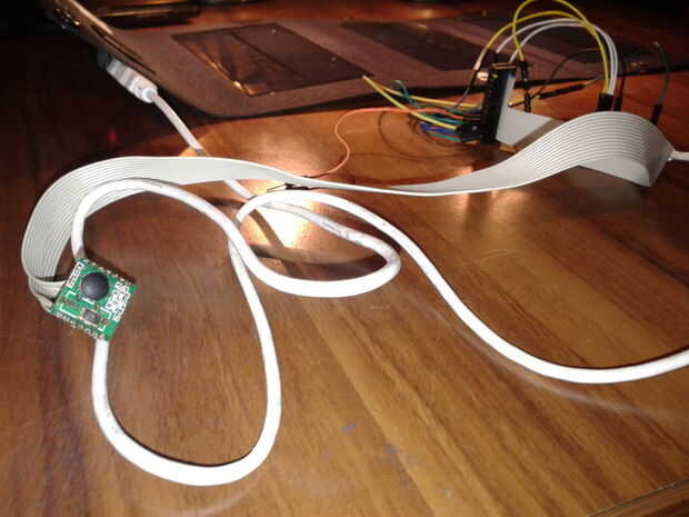 Para reducir el ruido de los activos componentes electrónicos coloqué la radio más lejos usando una cinta de disco duro cable, así podría utilizar la protoboard con alambres adecuados.