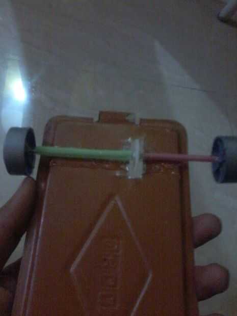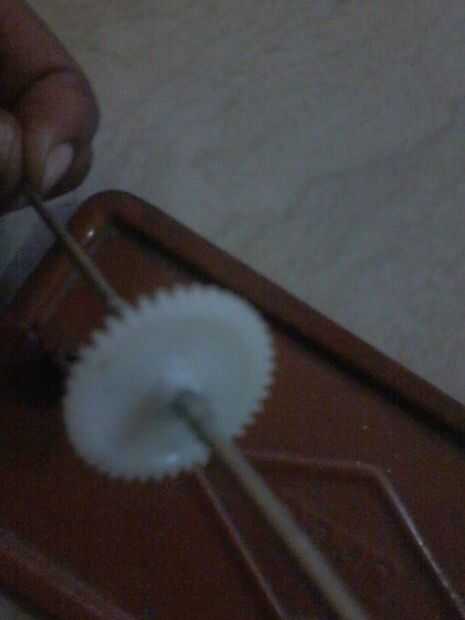 Tomar un palo de hierro y fijar el equipo adecuado para su motor y el palo de hierro, después de que un engranaje de fijarlo al motor, fijarlo con la pistola de pegamento caliente después de fijar las ruedas a la marcha que se fija el palo de hierro.