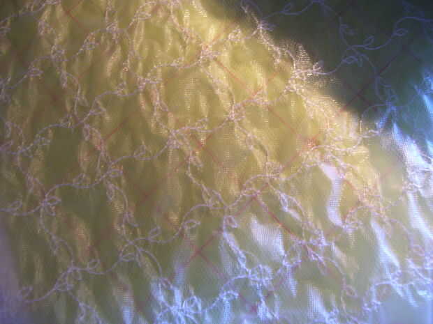 2. Sandwich el tul entre las dos piezas del estabilizador, con la colcha hilvanado spray para mantener el tul de la mudanza.