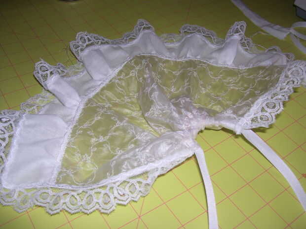 4. Tire de la cinta para recoger la gorra hacia atrás y atar el arco para formar la parte posterior de la capucha. Ajustar para ajustar alargando o acortando esta cinta.