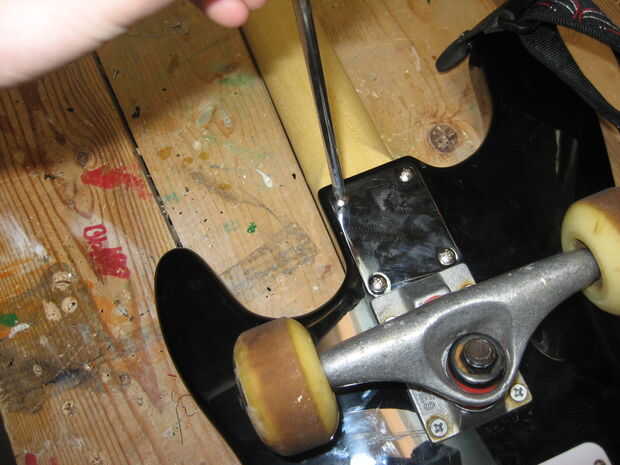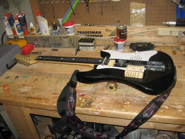 OK es la parte más difícil de todo el proyecto. Lo que usted tendrá que hacer es primero encontrar una guitarra eléctrica proyecto estás dispuesto a desmontar (no te asustes si no tienes uno leer) todo lo que necesita de ella es el cuello diapasón cuerdas y clavijas de afinación. Mal post una foto de la guitarra de proyecto que utiliza. Ahora desmontar el cuello de la guitarra. Debe haber cuatro tornillos en la parte posterior. * Asegúrese de que ha sacado las cadenas. Luego vas a querer mirar tus 6 cuerdas y asegúrese de que tienen una bolita en el extremo de ellos. A continuación tendrá que perforar los 6 agujeros en la parte inferior del cuello de la guitarra. Como la parte inferior. Así que 6 agujeros en una línea en la parte inferior.