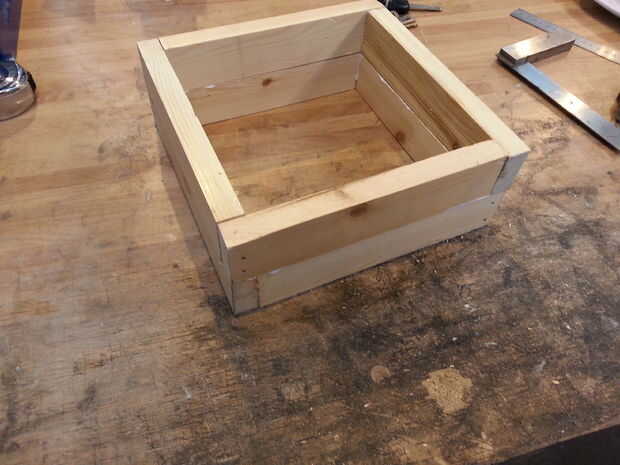 Montaje muy simple, una vez que ha decidido sobre el tamaño del marco. l corta ocho trozos de madera blanda de 2 "x 1" (esto es muy barato de la yarda de madera local o centro de bricolaje) y luego sólo pegado y clavado de las esquinas para formar dos cuadrados.. .remember estos están destinados a ser angustiado hasta la más áspera la madera acabado y corta mejor!!!!!! Luego simplemente pegué las plazas juntos alternando los cortes de la esquina.