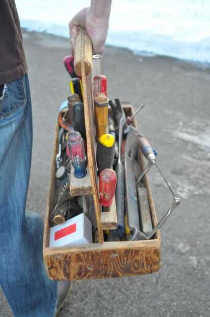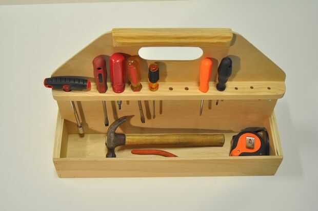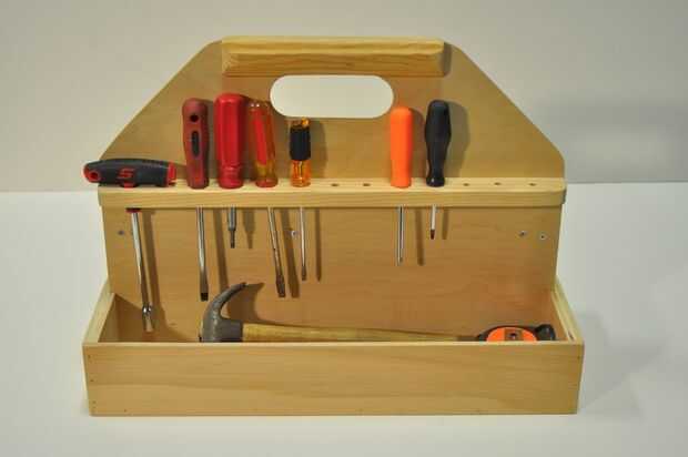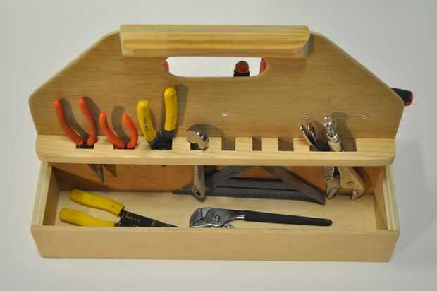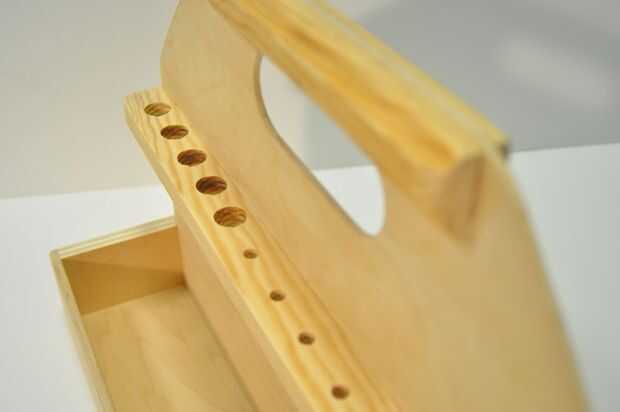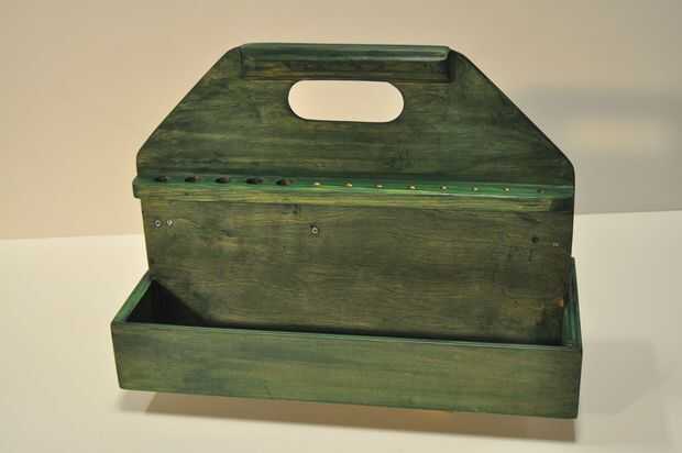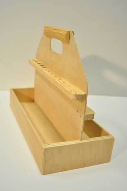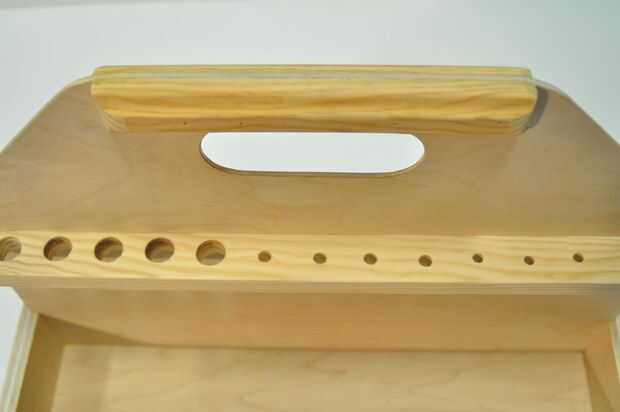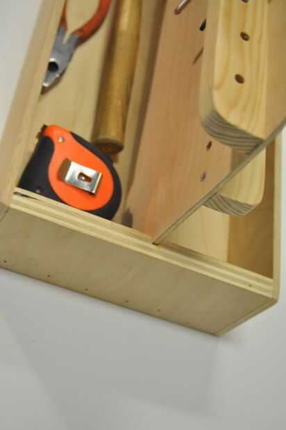 Los soportes de retención de la herramienta en ambos lados de la caja son fuera de serie, por lo que ambos pueden fijarse con tornillos a través de la parte trasera. Un lado tiene agujeros perforados a través de él para destornilladores y herramientas similares. El otro lado se corta con una sierra caladora, para alicates, tijeras y herramientas de mano similares.