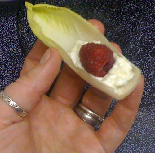 Mezclar un poco de azúcar y vainilla extracción en algunos ricotta (endulzar al gusto). Vierta la mezcla en hojas de endibia y corone con una frambuesa fresca, madura.