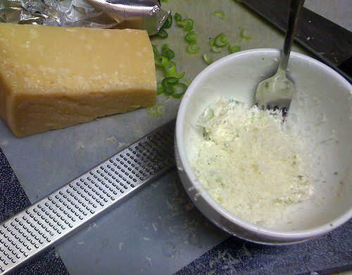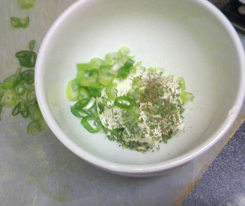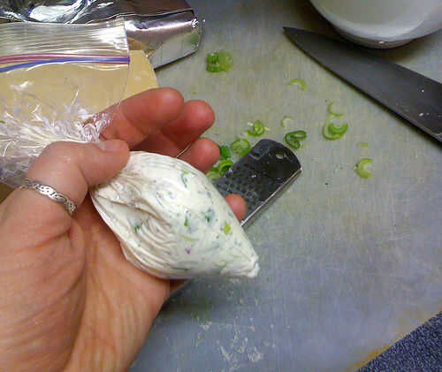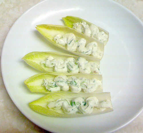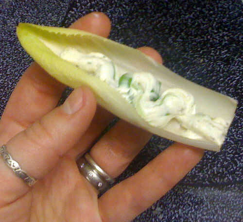 Ablandar queso crema y batir hasta que esponje. Agregue hierbas recién picados, cebolla verde, un poco de sal y pimienta. Si tienes un buen parmesano y un microplane, afeitarse un poco; queso parmesano agrega profundidad al sabor. Cucharada de mezcla de queso crema en una manga pastelera o una bolsa de ziplock con la esquina cortada y tubo una pequeña cantidad en lanzas de escarola.