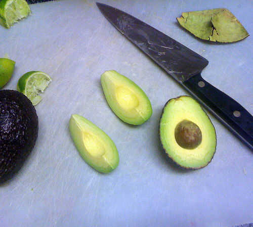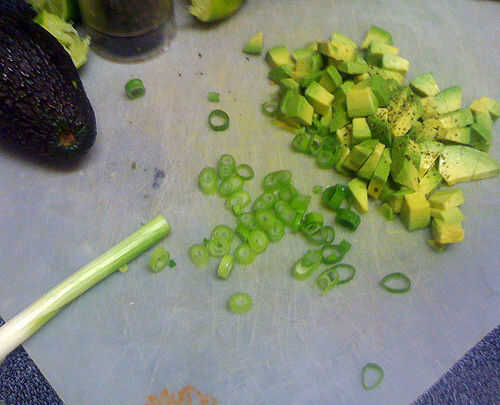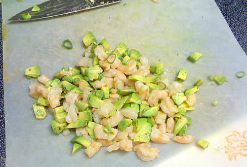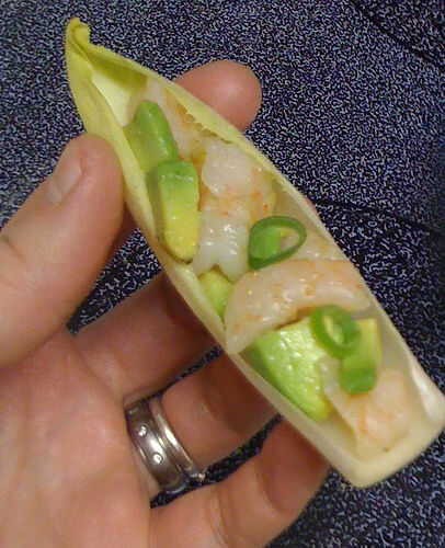 Cortar un aguacate maduro y exprimir el jugo de limón un poco. Revuelva suavemente con camarones cocidos picados o cangrejo; Si eres demasiado vigoroso, la palta mush y cubrir todo con verde. Es aún sabroso, pero no es la mirada que usted va para. Sazonar con sal, pimienta negra y una pizca de cayena (opcional) y espolvorear en algunas cebollas verdes en rodajas. Mezcla de cuchara en lanzas de escarola.