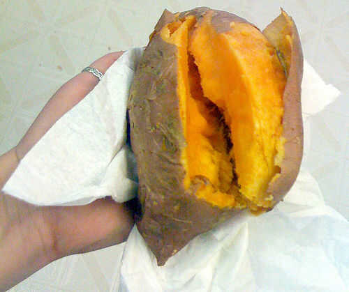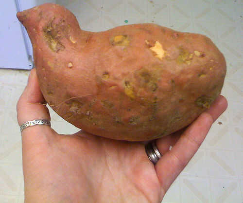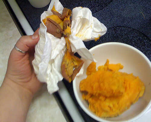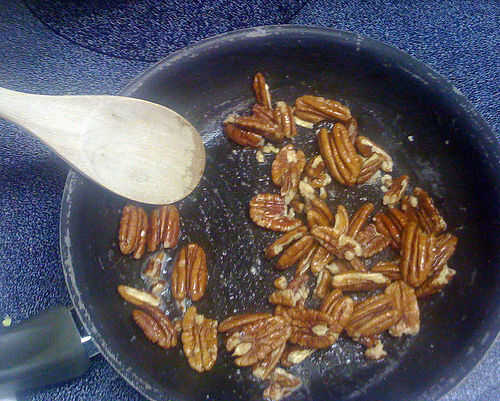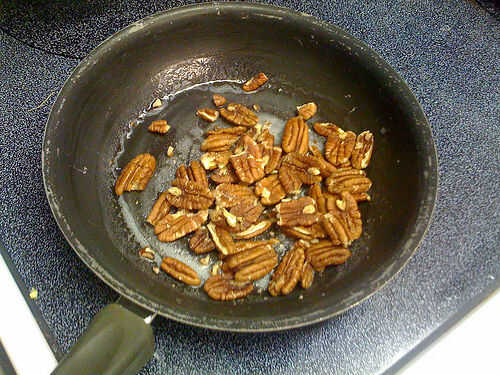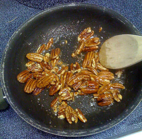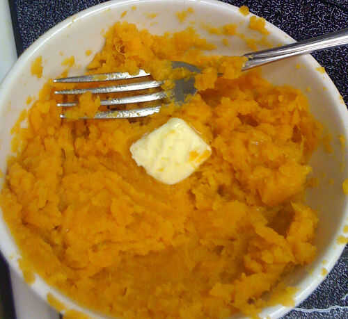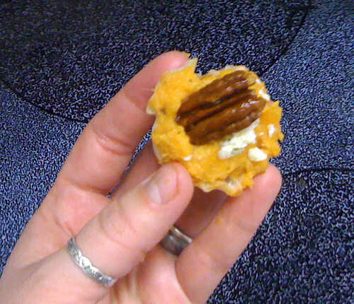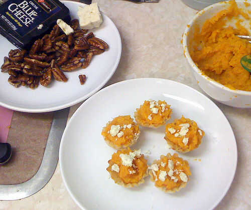 Cueza al horno y puré de alguna calabaza, calabaza o patata dulce. Añadir un poco de mantequilla, pimienta, tomillo y sal al gusto. Dejar de lado que se enfríe. En una olla pequeña, derretir un poco de mantequilla a fuego medio (sólo para cubrir la parte inferior). Mezcle en un puñado de nueces crudas. Tostar suavemente, revolviendo o agitando la sartén con regularidad. Después de unos minutos, rociar miel o jarabe de arce. Seguir revolviendo hasta que se tuestan las nueces y el agua de la miel o el jarabe ha cocinado, dejando las tuercas cubiertas con un glaseado. Cuchara o pipa de calabaza/batata en las cáscaras. Espolvorear sobre las tuercas (o solo uno si son mitades) y se desmenuzan en un poco de queso azul.