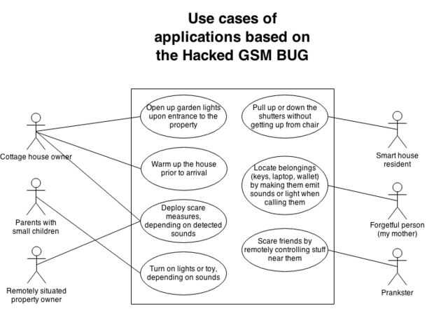 Utilizando este bug GSM barata para controlar otros circuitos o envío de señales se abre un gran campo de oportunidades. Puede ser utilizado en usos caseros de la automatización, vigilancia y control remoto, en lugar de un módulo GSM más caro y complicado. He compuesto un diagrama de caso de uso indicativo que muestra numerosas ocasiones donde podría aprovecharse este simple "truco". Estaría encantado de conocer tus ideas, así que no dude en contactar con me si usted tiene comentarios o preguntas.