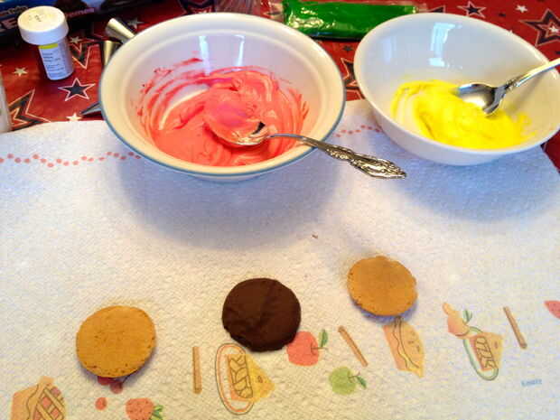 Usted puede utilizar cualquier tipo de helar desea, asegúrese de no necesita ser refrigerado y que es blanco para que usted puede mezclar colorante en él. Mezclar unas gotas de colorante en tazones con aproximadamente un cuarto taza del blanco glaseado en cada uno y colocar en las bolsas de plástico. Corte una punta pequeña de la esquina de la bolsa de plástico para la cubierta de la pipa.