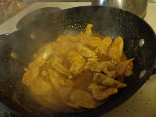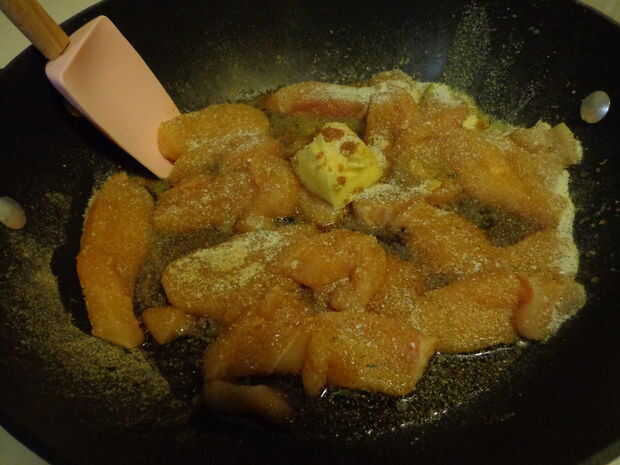 En un wok o en otros grandes de la cacerola, freír el pollo con 3-4 cucharadas de salsa de soja y 2 cucharadas de mantequilla a fuego medio.
