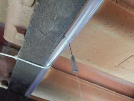En mi caso, las macetas están colgando de las vigas del porche y me dio todas las oportunidades que necesitaba para encajar el tubo en todo el recorrido. Pasé casi 30 metros de tubería para llegar a todos los cacharros. Ajuste el tubo cada 30 centímetros o con una correa de nylon, pero evitando apretar el tubo para mantener la trayectoria del agua libre.