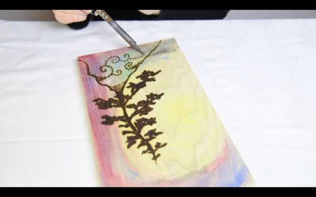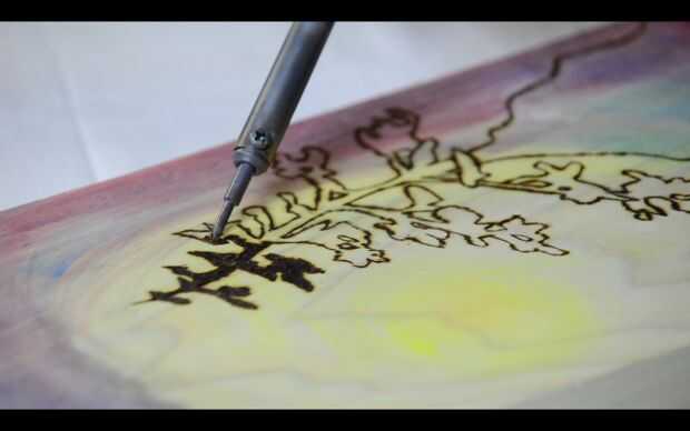 Trazar el contorno del árbol con su herramienta. Rellena el árbol presionando la punta en la madera en un ángulo pronunciado y rodar. Esto le dará a la madera una textura irregular que parece 3D.