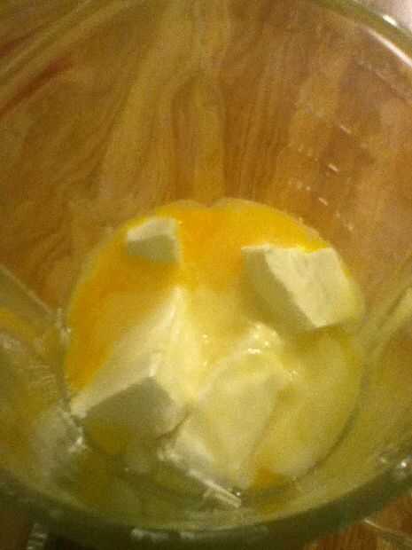 En la licuadora poner los 2 huevos, 12 onzas de queso crema, 12 oz de leche condensada. Mezclar hasta que se mezclan todos los ingredientes.
