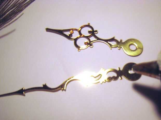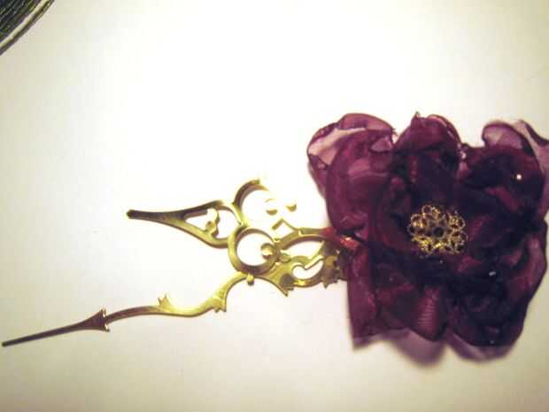 El último paso es poner una línea de pegamento caliente en la pinza y presionar en la parte posterior de la disposición de las manos del reloj de flores de plumas, como se muestra en las fotos.