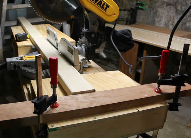 Para acelerar el proyecto, que utiliza una sierra para cortar ingletes y mesa y reprimieron una tabla de desecho para hacer una valla. De esta manera, todos los cortes se pueden hacer rápidamente y exactamente la misma longitud. Ya que no puedo ajustar una hoja completa de la madera contrachapada en mi coche, les tenía rasgar en dos paneles, cada 2 pies de ancho por 8 pies de largo. Decidí ir con una longitud de 6 pies de la mesa de trabajo, 24" ancho y una altura total de 34", por lo que correspondería con mi banco de la carpintería.