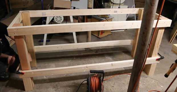 proceso como en la segunda parte, agregar otro par de tableros de 6' y 21" tableros de la parte inferior de tu 4 x 4. Depende de usted en cuanto a nivel del suelo será la plataforma. Elegí 8" por lo que tendría un montón de espacio para almacenamiento y para que mis pies no topetón con ellos mientras trabaja cuando el Banco haya terminado. Utilizar sus pinzas para ayudar a mantener las tablas en su lugar mientras les taladra.