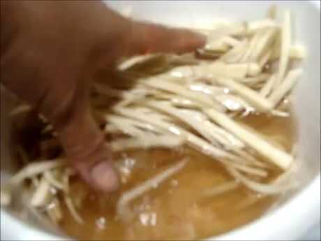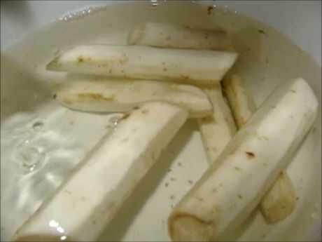 Cortar los trozos en rodajas finas y otra vez cortado longitudinalmente para hacer astillas. Vuelva a colocar en el agua.