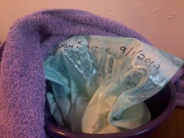 Con que sea el final del verano, estamos utilizando nuestra sala de lavandería que también tiene un poco de humedad para ayudar a la fermentación. Cubrir la bolsa y el recipiente con una toalla y dejar reposar de 4 a 8 horas hasta que el motor de arranque se ha duplicado en tamaño. Estará listo para usar cuando parece pegajosa, elástica y burbujeante.
