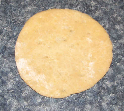 Suavemente, estirar la masa uniformemente en todas direcciones para formar una hoja de 14 "x 14". Ahora corte 6-6" rondas fuera de la lámina de masa (yo usé la tapa de una olla, que funcionó muy bien, sin embargo hará cualquier objeto redondo como una plantilla). Puede que necesite el disco de masa de modelar y rodar hacia fuera una segunda vez, para conseguir todos 6 rondas.