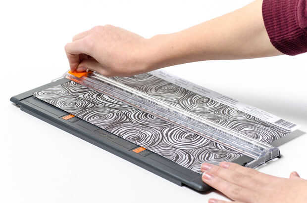 Cortar el papel azul 5 1/2 "x 2 1/4", y el papel de remolino blanco y negro 5 1/2 "x 1 7/8".