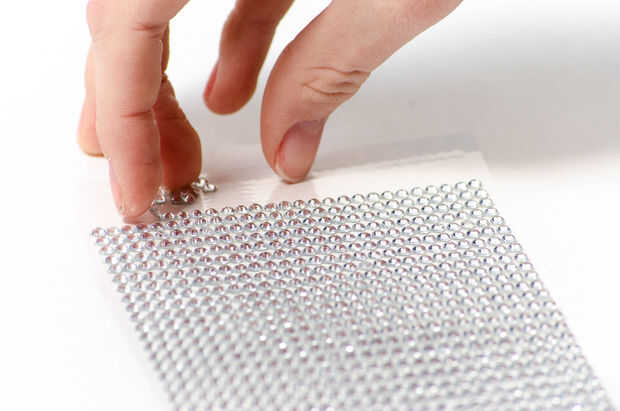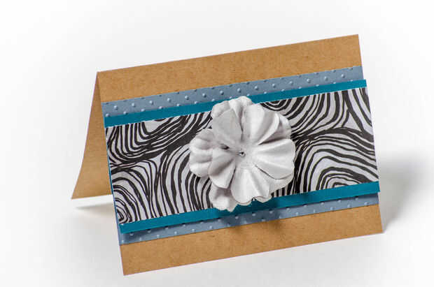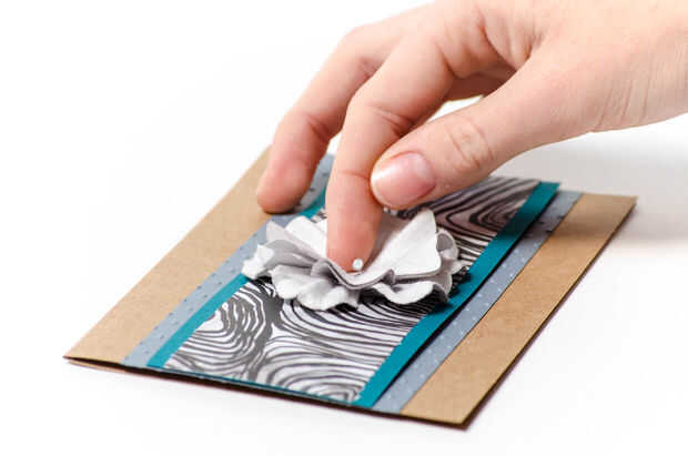 Terminar la tarjeta mediante la adición de una pequeña joya de plata en el centro de la flor. Si sus joyas no son pegajosos en la parte posterior, que tenga usar pegamento líquido para fijarlo.
