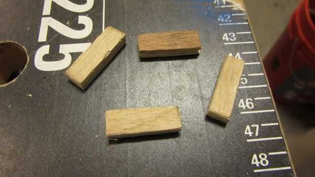 - Cortar 4 pequeños 1/4 "x 1/4" x 3/4" piezas de madera. Estos son bloques de tope para el fondo falso.