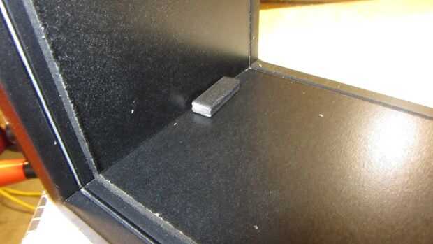 - Pegamento abajo en las esquinas de la caja tal que desde el frente del vidrio hasta el final del bloque más alejado del vidrio es aproximadamente de 1,75". Esto debe crear un falso fondo con una profundidad de 1.5" o 2" si no está conectado el panel posterior.