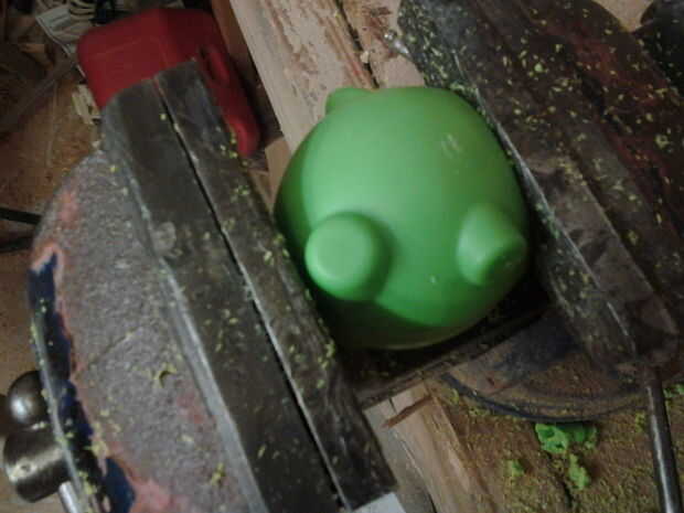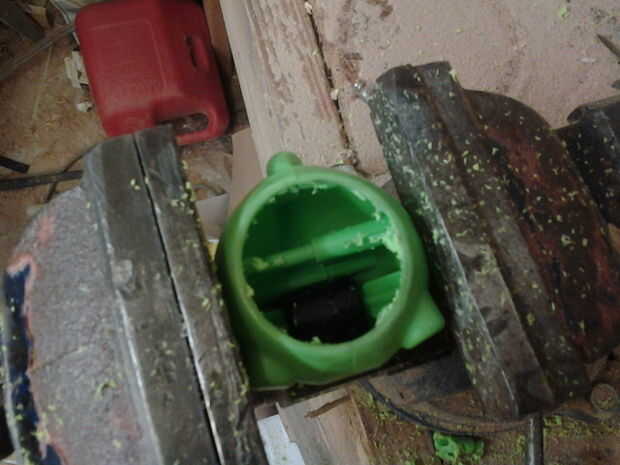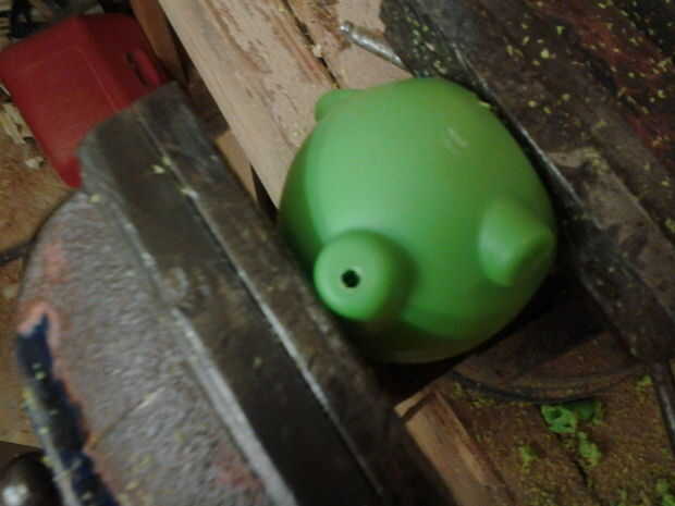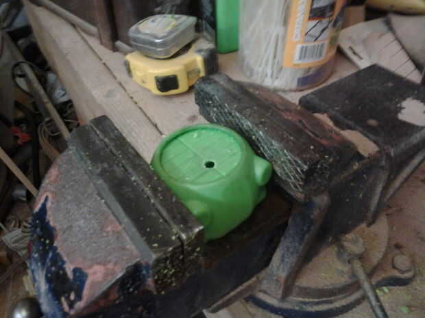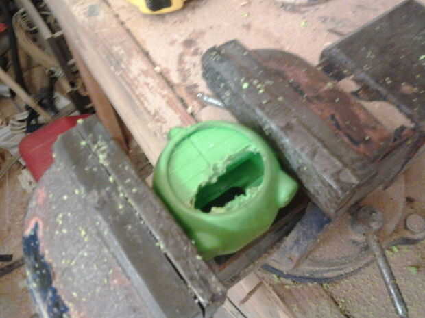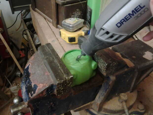 Ahora utilizar la dremel para quitar la capa exterior de plástico en la cara solía ser. Comience con un pequeño agujero y poco a poco hacerlo más grande. Entonces después de haber eliminado que ponerlo en su lado y perfore su pie. Recuerde utilizar la broca pequeña primero.