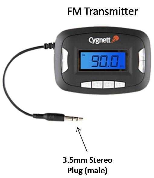 El enchufe estéreo de 3,5 mm del transmisor FM se enchufa en el RCA al cable del adaptador de 3,5 mm, que a su vez se conecta a la salida de audio del televisor.