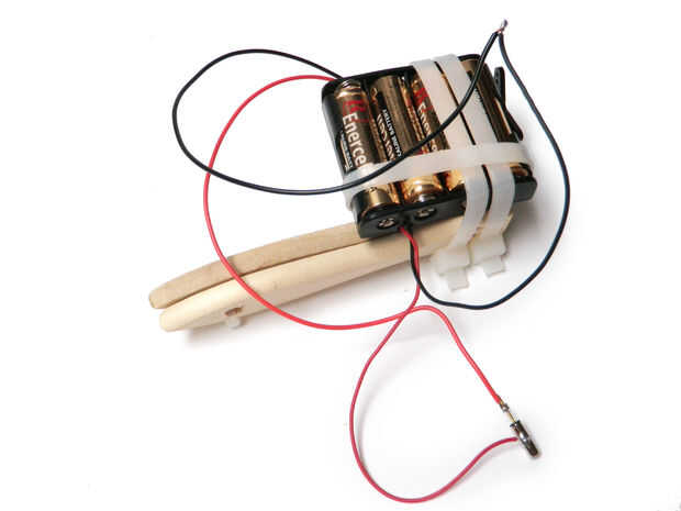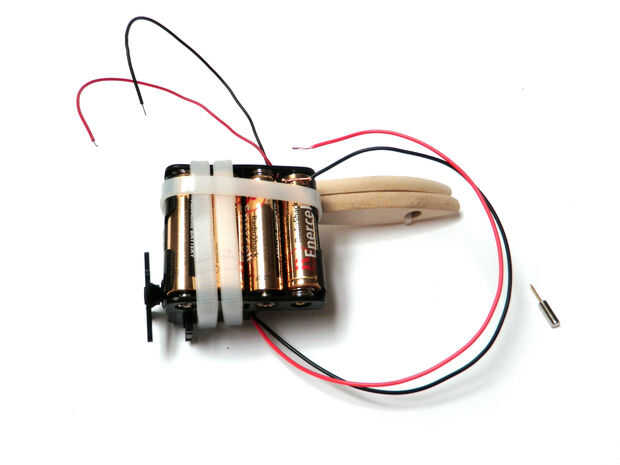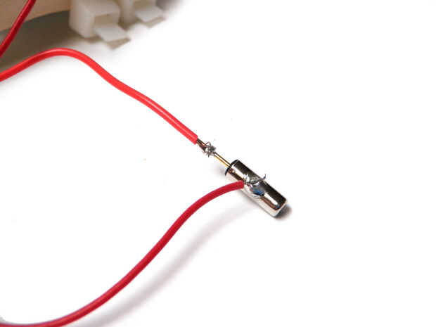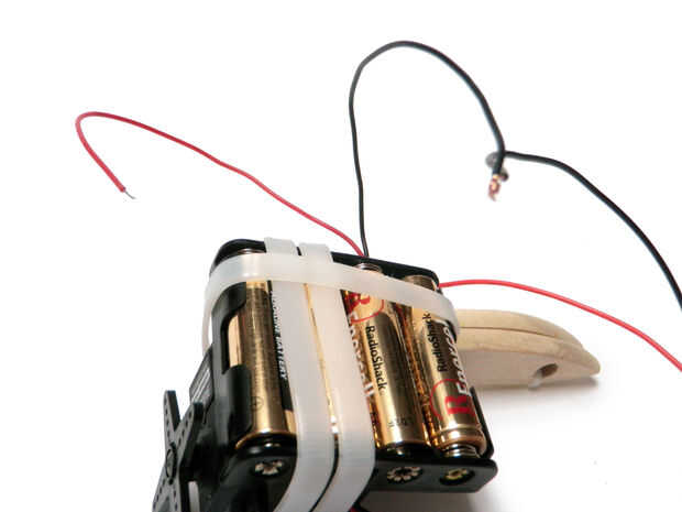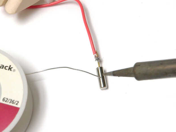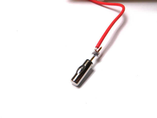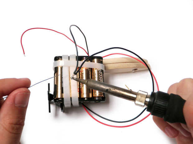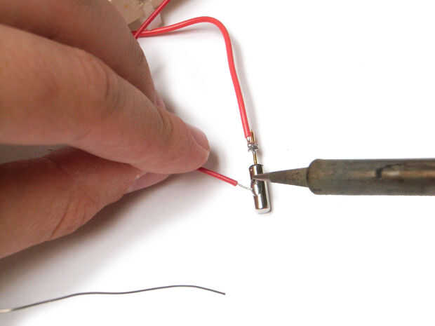 Suelde el cable rojo desde el portapilas a la espiga de pequeño que se pega fuera del interruptor de inclinación. Suelde el cable rojo del motor a la carrocería metálica redonda del interruptor de inclinación.