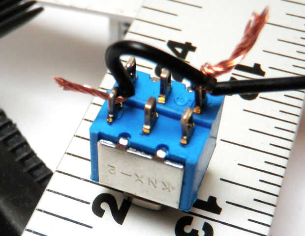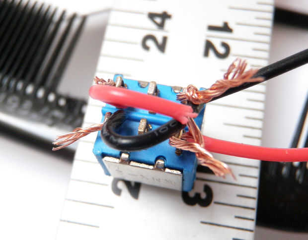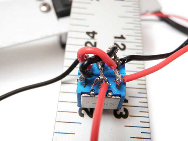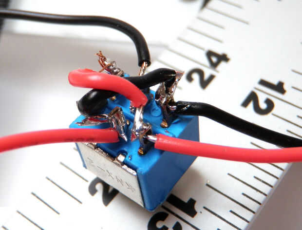 Soldar un cable rojo de la clavija de la izquierda inferior a la parte superior derecha. Soldar un cable negro de la parte inferior derecha, a la parte superior izquierda.