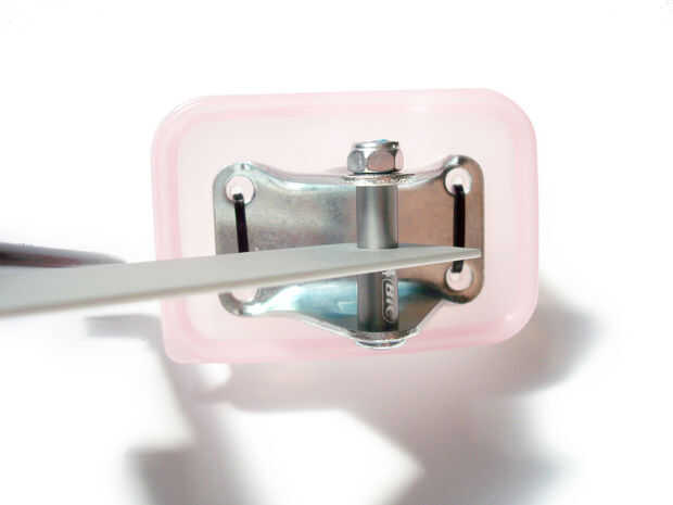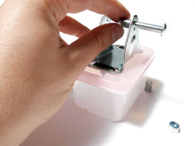 Utilizando la tornillería de montaje de ruedas y los espaciadores de la pluma, fije las reglas para los envases de plástico.